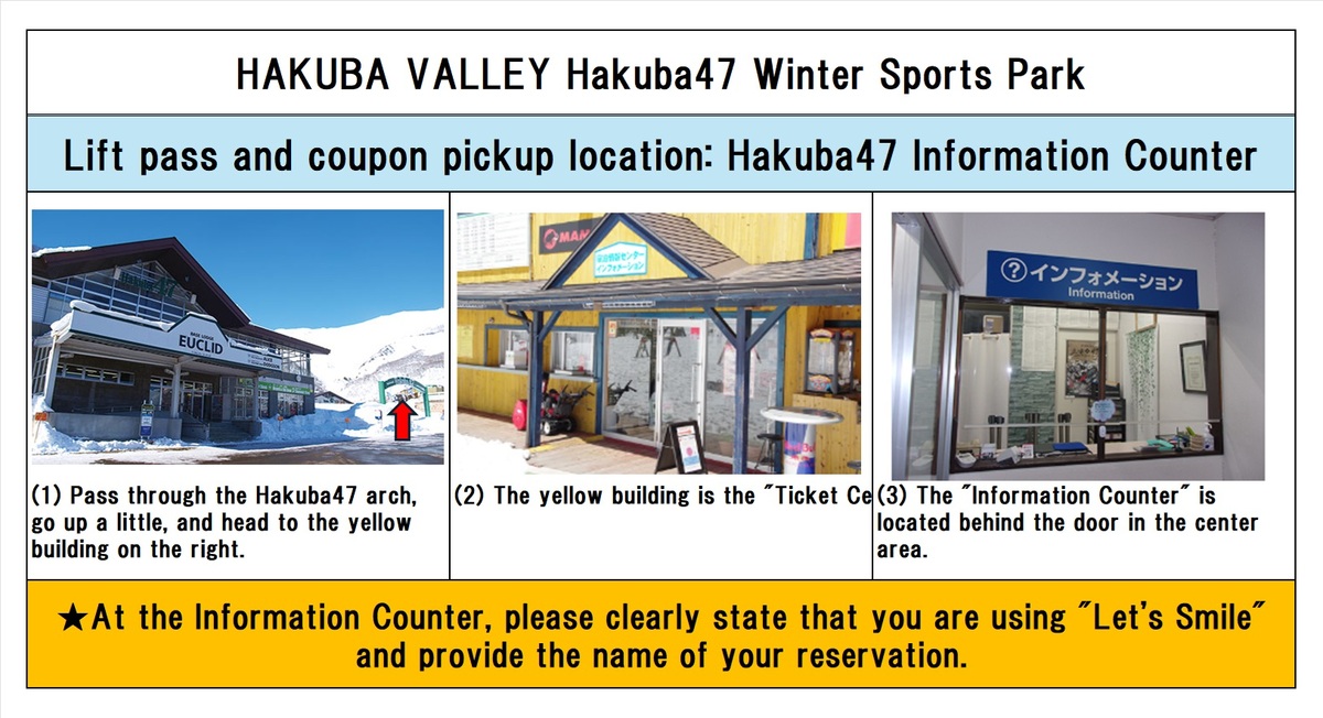 Meal ticket & coupon pickup location: Hakuba Valley Hakuba47 Winter Sports Park Information Counter Directions