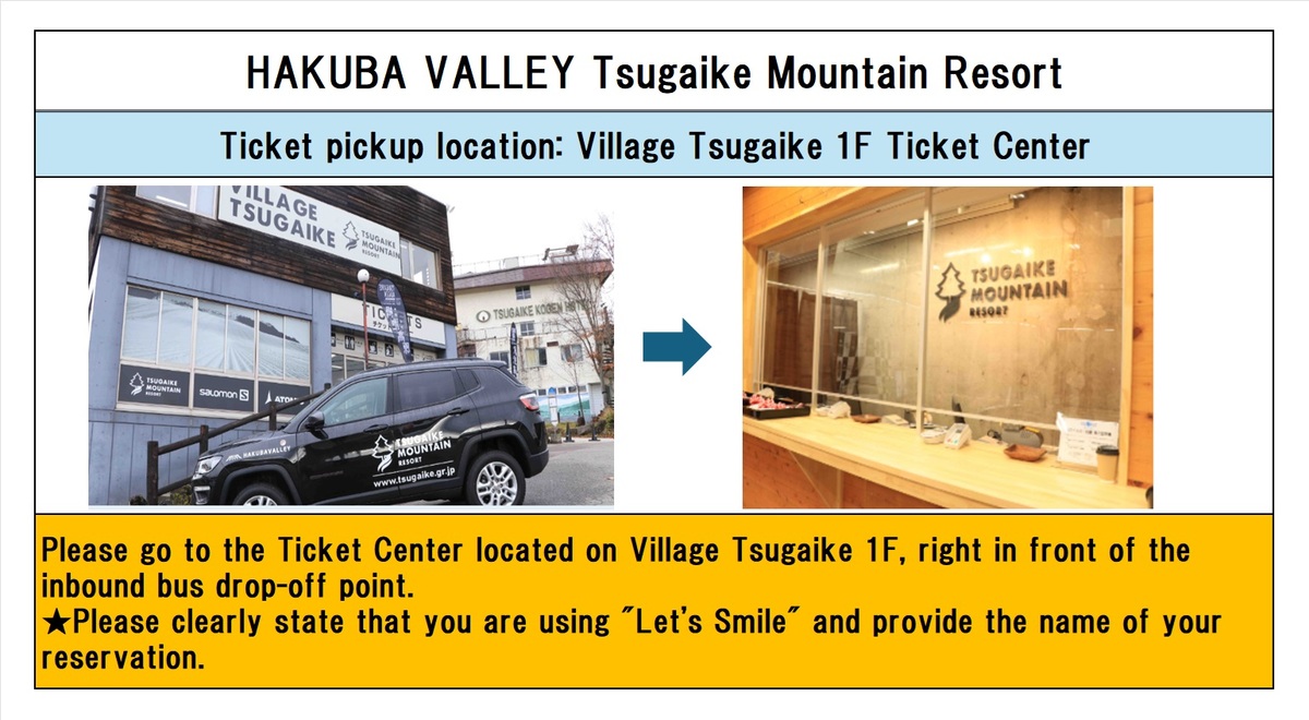 • Lift passes and rental discount coupons will be handed out at Village Tsugaike 1F Ticket Center.*When redeeming, clearly tell the reception staff that you are using "Let's Smile" and provide the name used for your reservation.