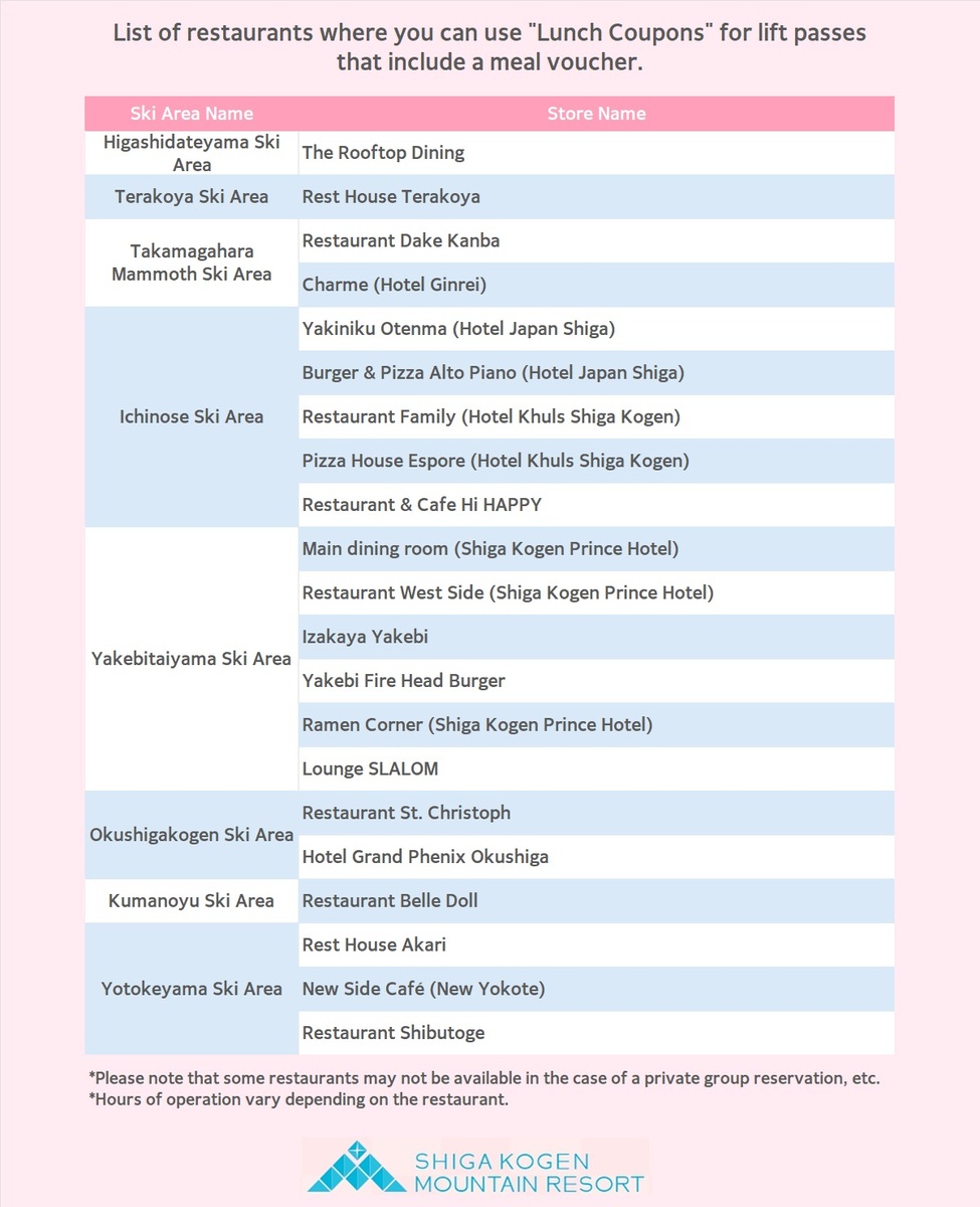 List of locations where meal tickets can be used *Subject to change. Please check the ski resort's official website for the latest information.