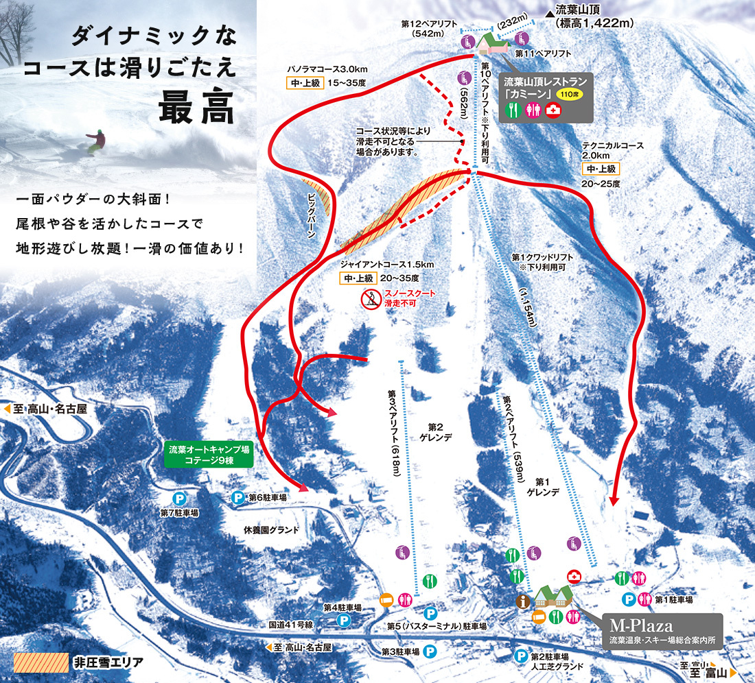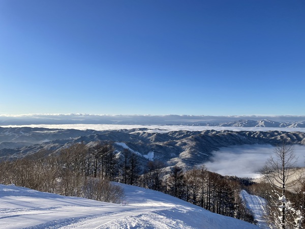 The ski area has a variety of courses and slopes, including mountain ridges with great views, steep slopes, and wide gentle slopes. A wide range of skiing is available for beginners, families, and advanced skiers. The top of the mountain offers a 360-degree panoramic view of numerous mountains. Nagarehayama has a hidden beech forest slope on the back side that attracts people looking for powder snow and fun terrains. If you are lucky, you can see sea of clouds and frost-covered trees. There are also gentle slopes at the top of the mountain where beginner skiers can enjoy the spectacular view. The lift descends to the base of the mountain, so there is no need to worry if you are not comfortable with intermediate to advanced courses. Hot springs and local cuisine are also attractive.