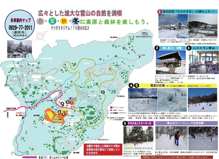 Dec. 23rd to Feb. 28th (*May be open only on weekends & public holidays *Depends on snow conditions)The gentle slopes are ideal for sledding and snow activities for families with small children. Rent some snowshoes, and venture off into the snowy mountains on a cross-country course with just your backpack. The clusters of fir trees add to the beautiful scenery.