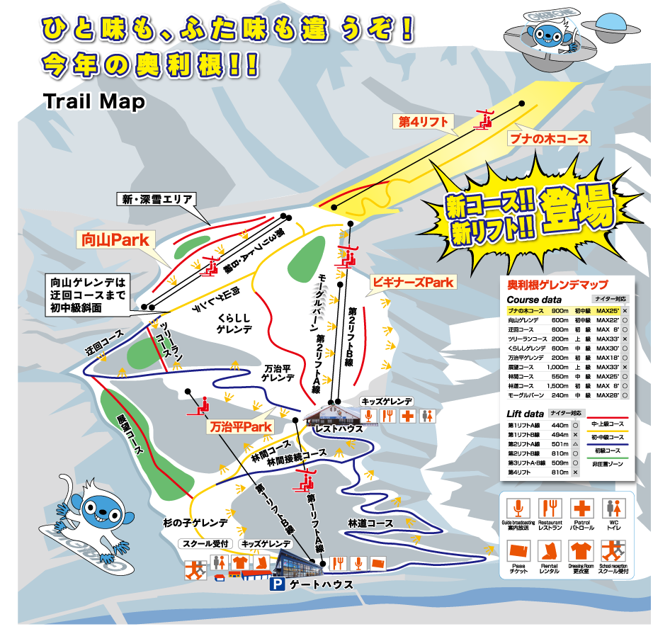 Just about a two-hour drive from the Tokyo metropolitan area, Okutone Snow Park offers a long 2,500-meter run with a 500-meter elevation difference. With state-of-the-art snow machines, the powder snow feels just like natural snow, and there's a wide variety of trails to explore! Children who are elementary school age and younger can ride the lifts for free all day. With up to 18 hours of operation, weekend night skiing is available until midnight, and most slopes are accessible even in the early morning or at night. Numerous events are also planned throughout the season. Come experience the fun at Okutone Snow Park!