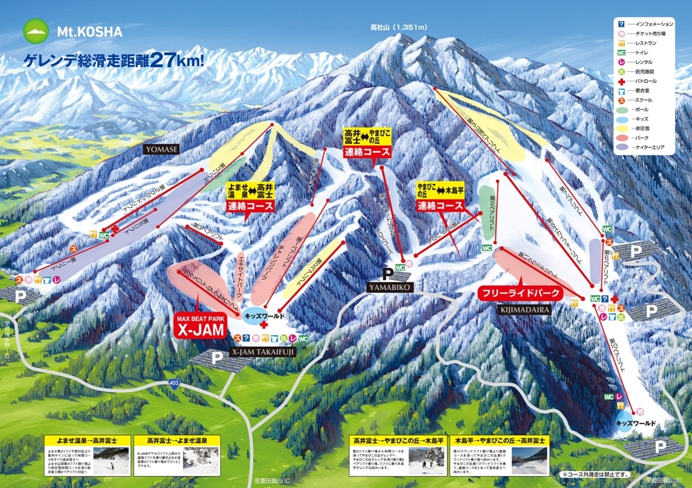 The X-JAM Takaifuji ski resort features a park for all skill levels, from beginners to advanced. With a multi-resort lift pass for Yomase Onsen Ski Resort, you can enjoy skiing at both locations. The slopes are spread out around the Ski Center, offering easy access from the parking lot. Plus, you can try exciting activities like Snowdrive riding and snow biking!