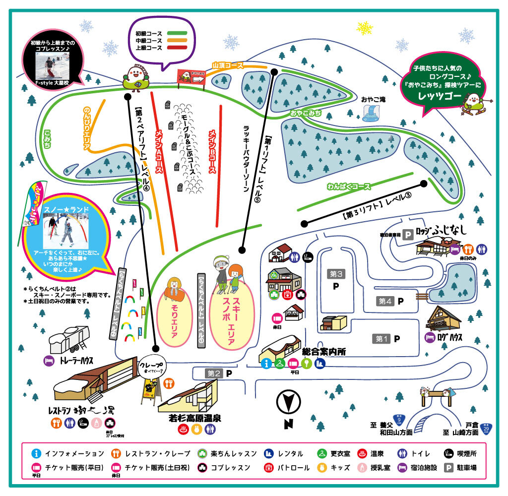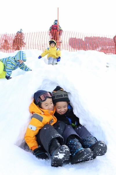 A convenient family ski resort just 150 minutes by car from Osaka and Kobe, featuring nearby slopes and parking. For kids skiing for the first time, trust Rakuchin Lesson to guide them through everything—from putting on their skis to sliding, stopping, and even falling safely. The dome-shaped Rakuchin Belt, a conveyor-style ski lift, ensures an easy and safe experience, even in snowy or windy conditions. Younger children can enjoy sledding and playing in a separate snow area, giving parents peace of mind.