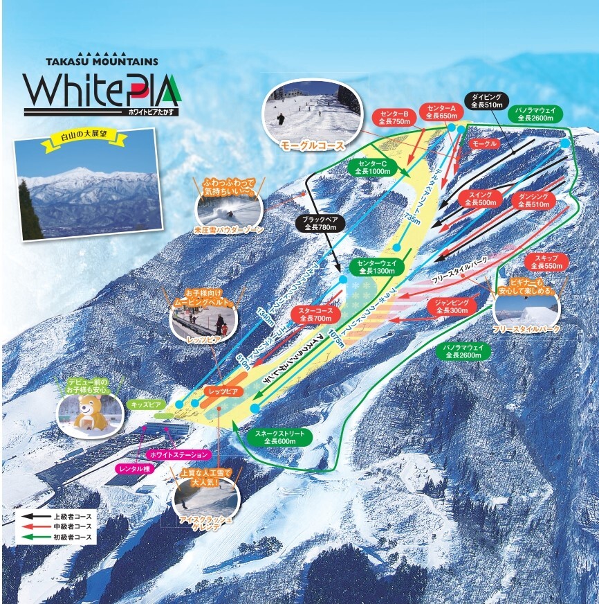Easily accessible from the nearest interchange, even those unfamiliar with driving on snowy roads can easily visit the resort. Thanks to the implementation of a state-of-the-art Ice Crush System, it can now open from November. During the winter season, the north slope offers excellent snow quality and a magnificent view of the Hakusan mountain range stretching out before you from the mountaintop for an extraordinary experience. Additionally, shared access to the neighboring Washigatake Ski and Snowboard Resort is now possible, making the expansive ski slope Washitopia an experience that should not be missed.